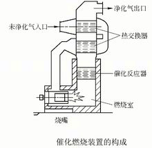 催化燃燒裝置主要由熱交換器、燃燒室、催化反應器、熱回收系統(tǒng)和凈化煙氣的排放煙囪等部分組成,如右圖所示。其凈化原理是:未凈化氣體在進入燃燒室以前,先經(jīng)過熱交換器被預熱后送至燃燒室,在燃燒室內(nèi)達到所要求的反應溫度,氧化反應在催化反應器中進行,凈化后煙氣經(jīng)熱交換器釋放出部分熱量,再由煙囪排入大氣。